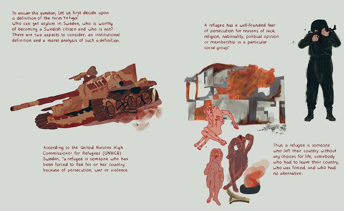 In Refugees Welcome?, Chalabi writes and draws about what kind of design the Migration Board uses to visualise the asylum process. The work becomes a place for memory and history writing where Chalabi tries to understand how to document a process that is prohibited to be documented by the person undergoing it. Illustration in Chalabi’s work is a tool that serves an aim beyond its practical aspect of depicting a narrative. It is a resistance against the restrictions of filming, recording, and photographing whatever happens inside the Migration Board’s offices in Sweden.